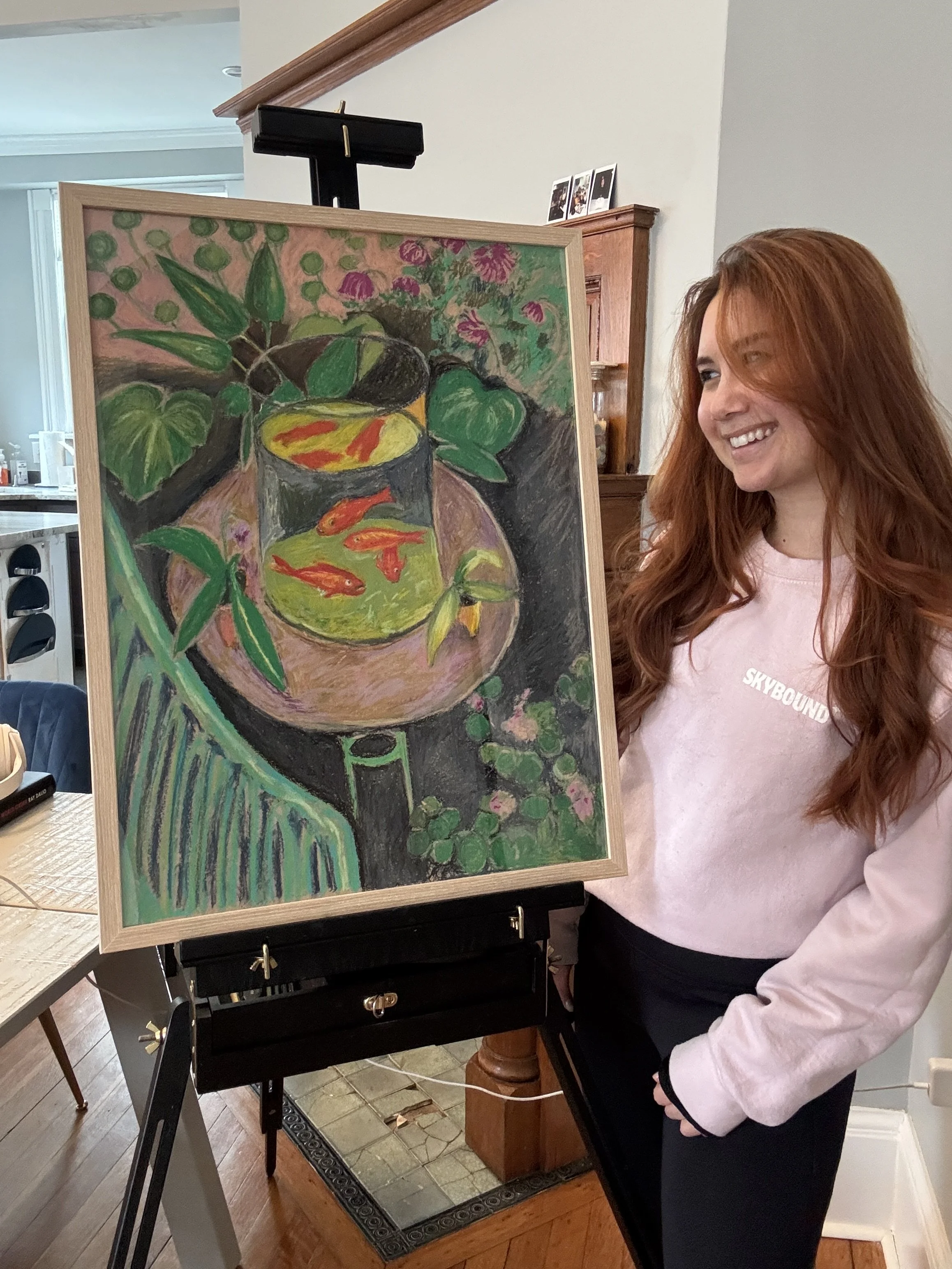I’m a Massachusetts-based, California-born, artist working in oil pastels and paint. My practice centers around movement, humor, and the emotional texture of everyday life—often inspired by animals, quiet moments, and the stories found in our communities.